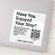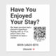 Encourage customers to leave a review. Message reads: "We hope you have had a pleasant experience staying with us. If so, please take a few moments to leave a review". Change wording to suit your requirements. Change the QR Code link to the link leading to your own reviews page. If Google, advice is given here: https://tinyurl.com/5ydtb22k
