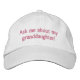 Cool gift for the proud grandpa or grandma with "Ask me about my granddaughter!" on an embroidered hat. Great Father's Day and Mother's Day gift ideas! Easy to customise the text.