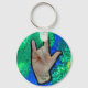 Hand painted silk is the background for this keychain design with the American Sign Language "I Love You" hand sign.