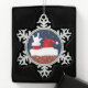 Santa Claus ILY Handshape Snowflake Ornament. On a snowy Christmas night, Santa Claus signs "I Love You" in American Sign Language as he goes down the chimney to deliver gifts.