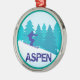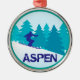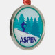 What better place to spend a Christmas holiday than on the ski slopes of Aspen, Colorado? Even if you can't be there in person, this keepsake ornament can take you there in spirit. It features a circle image in teal and blue of a silhouette snow skier in front of pine trees on a snowy mountain. The bottom has distressed text in blue that says ASPEN. *Clip art used in this design is copyrighted by Encore Software, Inc., which permits use to its licensors. All rights reserved.