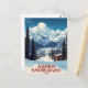 Hit the slopes with this gorgeous vintage-style postcard featuring Aspen Snowmass ski resort in Colorado, USA. The design captures the charming, snow-covered village nestled in a valley, framed by towering pine trees and dramatic, cloud-capped Rocky Mountains. This classic travel poster artwork is perfect for skiers, snowboarders, winter sports enthusiasts, and those who love high-country American scenery. Ideal for sending holiday greetings, keeping as a collectible souvenir, or framing as rustic lodge decor.