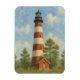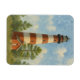 This watercolor image depicts the iconic Assateague Lighthouse in Virginia with a soft, watercolor design. The dominant feature is the lighthouse itself, rendered in crisp whites and reds, giving it a bright, clean appearance. Its tall, tapered form rises majestically, topped with a dark, contrasting lantern room that adds a focal point.
