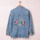 Humour reigns on this women's denim jacket reading, ASSEMBLED IN THE USA USING MEXICAN PARTS. Design shows both the flags of Mexico and United States of America. Share both your USA and Mexican heritages. Great to wear on Cinco de Mayo and 4th of July. Fun for family reunions, travel groups, and clubs. Great gift.