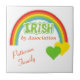 This is a cute tile to proudly display for St Patrick's Day and all through the year! It features a colourful rainbow with overlapping green and gold hearts at the end. In the middle of the rainbow is the stylised green text IRISH, and in orange, BY ASSOCIATION. Your custom text is in orange script at the bottom left. Perfect for the blended "Irish by Association" family! *Clip art used in this design is copyrighted by Encore Software, Inc., which permits use to its licensors. All rights reserved.