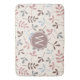 Illustrative surface pattern design of assorted leaf silhouettes in pastel colours of grey, pink, taupe/light brown and blue on a cream colour background with initial centre to personalise.