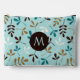 Illustrative surface pattern design of assorted leaf silhouettes in teal, cream, gold and brown on a light teal background with initial centre in light teal on brown to personalise.