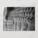 This black and white photograph depicts a detailed shot of the carving done on an ancient Assyrian sculpture on exhibit in Paris at the Louvre Museum. The image features small circular spirals that decorate the back of a griffin, fading through perspective into the structured wings of the stone animal.