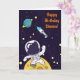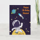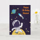 A birthday greeting card with a dark blue background with yellow stars scattered around. Layered over top is an illustration of a spaceman wearing a white astronaut suit floating above the moon. Waving hello as he explores space. Off in the distance is a planet with rings and a rocket ship flying off into space. Personalised message on the inside.