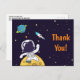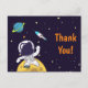 A thank you postcard with a dark blue background with yellow stars scattered around. Layered over top is an illustration of a spaceman wearing a white astronaut suit floating above the moon. Waving hello as he explores space. Off in the distance is a planet with rings and a rocket ship flying off into space.