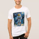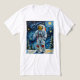 This vibrant artwork captures a fully suited astronaut standing amidst a snowy landscape with evergreen trees, set against a swirling starry sky reminiscent of Van Gogh’s Starry Night. The astronaut’s suit is detailed with American flag patches and red communication wires, reflecting an exploration theme that blends space travel with classic art.