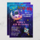 Girl Astronaut & Moon Birthday Party Invite features text saying, 3,2,1-- Blast off! It has a customisable astronaut posing with a crescent moon. Next there is a place to put the child's name. A rocket ship speeds by at the bottom. All against a starry sky. The back of the invitation has lots of cool space illustrations.