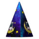 Astronaut Outer Space Kids Party Hat - On a beautiful background of the starry night sky, an astronaut is posing, nestled in a crescent moon, surrounded by stars. The astronaut image appears in 3 places around the hat. On the front at the peak is a rocket ship and a star. The front of the hat has customisable text at the bottom that reads, "Happy Birthday, Ethan"