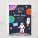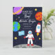 Outer Space Baby Shower Invitation featuring an astronaut on the moon with a rocket ship, planets, and stars in a far-off galaxy. Include the back for a close up of the rocket blasting into space ready for the baby shower fun.