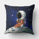A whimsical illustration of a cute cartoon astronaut, spaceman sitting on top of the moon. The spaceman is wearing an orange spacesuit, white gloves and white helmet with a black visor. He has a badge at the top of his arm and dials and buttons on the front of his suit. On his back is a backpack for his air. He has one arm to his side and the other bent up to his helmet to make him look like he is thinking. His legs are outstretched in front of him. He is sitting on top of a grey/white moon that has shadows and craters. The background is a black and blue galaxy with bright white twinkling stars.