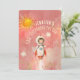 Blast off into a year of adventure with our "Astronaut's First Trip Around the Sun" birthday invitation! The front features a daring little astronaut in a vintage space suit, rocketing past stars and a radiant hand-painted sun, all set against a whimsical, starburst coral background. The back of the invitation continues the cosmic journey with party details written in a playful font that resembles twinkling stars, echoing the solar theme. This invitation is perfect for your little explorer's first birthday party, promising an out-of-this-world celebration.