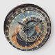 photography in black blue and orange. detailed colour photography of a historical, mediaeval landmark, an old astronomical clock in prague in europe with blue, orange, and brown, astrology signs and roman numerals. photography in blacks blues and oranges.