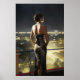 Painting of a beautiful young Puerto Rican woman in an open-back cocktail dress thoughtfully standing at a glass railing on top of a Miami high rise building overlooking the city at night.