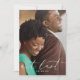 An elegant and modern save the date announcement card, inspired by the Etta James song - At Last. This design features your favourite engagement photo overlaid with "at last" in elegant white modern calligraphy font and your wedding date. The reverse is in solid black with your wedding details in black.