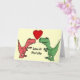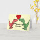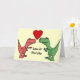 Hilarious cartoon green male and pink female t-rex dinosaurs lovers greeting card says Love at first bite. Cute and fun and full of personality. Great gift idea.