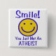 Put a human face on Atheism with a bright yellow face outlined in blue with blue letters that says: "Smile! You just met an ATHEIST."