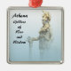 Square premium ornament with an image on gradated blue of a statue of Athena, the Greek Goddess of wisdom, symbolized by the Pearl of Wisdom she holds in her outstretched hand, and of war and crafts. See the entire Toga Ornament collection in the PARTY FAVORS section.