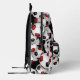This cool soccer backpack features a random pattern of varied size maroon, black and white soccer balls turned every which way on a black background - customise with the soccer player's monogram - by katz_d_zynes