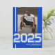 Celebrate your graduate's big day in style with our modern blue athletic photo graduation party invitations. The bold white varsity font features the class year, complementing a photo of the proud graduate. With a streamlined customisation process, each card embodies your graduate's unique spirit, perfect for athletes of any gender. Not only does the front of the card sport an elegantly understated design, but the reverse also holds space for a personalised celebration template. Unforgettably stylish, these invitations are the perfect send-off for your sports-loving grad.