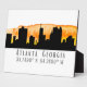 Modern tabletop art plaque features Atlanta Georgia city skyline silhouette with sunset watercolor splash and latitude & longitude map coordinates