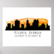 Modern poster features Atlanta Georgia city skyline silhouette with sunset watercolor splash and latitude & longitude map coordinates