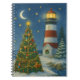 A festive lobster trap tree decorated with buoys and lights stands by a snow-covered lighthouse under a starry sky. Inspired by Christmas in Maine.