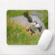 Mousepad with an atlantic puffin birdflying with spread wings before landing at the island of Runde at the Atlantic coast of Norway.