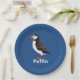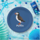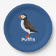 A digital painting of an Atlantic Puffin with text reading "Puffin" on a blue background. The Atlantic Puffin (Fratercula arctica) feeds primarily by diving in the water. They breed in large colonies on coastal cliffs or offshore islands in the North Atlantic. Puffins shed the colourful outer parts of their bills after the breeding season, leaving a smaller and duller beak. Their short wings are adapted for swimming with a flying technique under water. In the air, they beat their wings rapidly (up to 400 times per minute) in swift flight, often flying low over the ocean's surface.