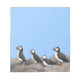 Puffins at rest on the rocks. The Atlantic Puffin (Fratercula arctica) feeds primarily by diving in the water. They breed in large colonies on coastal cliffs or offshore islands in the North Atlantic. Puffins shed the colourful outer parts of their bills after the breeding season, leaving a smaller and duller beak. Their short wings are adapted for swimming with a flying technique under water. In the air, they beat their wings rapidly (up to 400 times per minute) in swift flight, often flying low over the ocean's surface.