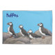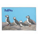 Puffins at rest on the rocks. Customisable text reading "Puffins" also appears. The Atlantic Puffin (Fratercula arctica) feeds primarily by diving in the water. They breed in large colonies on coastal cliffs or offshore islands in the North Atlantic. Puffins shed the colourful outer parts of their bills after the breeding season, leaving a smaller and duller beak. Their short wings are adapted for swimming with a flying technique under water. In the air, they beat their wings rapidly (up to 400 times per minute) in swift flight, often flying low over the ocean's surface.