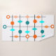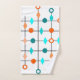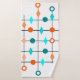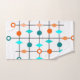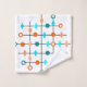 This towel set has mid-century modern design of a grid in black lines with orange and teal circles and diamonds.