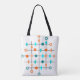 This tote bag has mid-century modern design of a grid in black lines with orange and teal circles and diamonds.