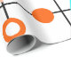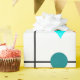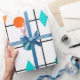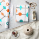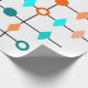 This wrapping paper has mid-century modern design of a grid in black lines with orange and teal circles and diamonds.