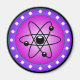 Science themed image. A circular shaped image with the symbol of the atom inside. A pink background contrasts with the black symbol. A purple border with white stars circles around the illustration. A cool image for geeks and science buffs.