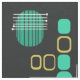 A mid century modern abstract art design that would have fit right in during the 1950s. Various shapes of oval circles and lines in turquoise and gold against a black background.