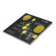 A mid century modern abstract art design that would have fit right in during the 1950s. Various shapes of oval circles and lines in yellow and grey against a black background.