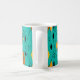 This mug has a mid-century modern atomic design of diamonds, and starbursts on a field of turquoise.