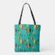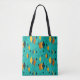 This tote bag has a mid-century modern atomic design of diamonds, and starbursts on a field of turquoise.