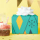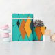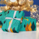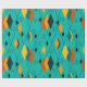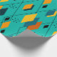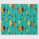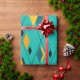 This wrapping paper has a mid-century modern atomic design of diamonds, and starbursts on a field of turquoise.