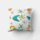 Atomic Inspired Pillow Design, Mid Century style hand drawn by artist. White background with pink, blue boomerangs and atomic star patterns.