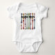 This baby bodysuit has a mid-century modern design of atomic lines with "feathers" on either end and an outline around each one.