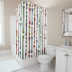 This shower curtain has a mid-century modern design of atomic lines with "feathers" on either end and an outline around each one.