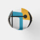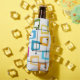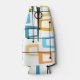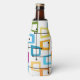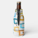 This bottle cooler has a design of rectangles that are stretched on one end in groovy colours, orange, green, teal, purple, blue, pink, and yellow with atomic lines crisscrossing them.