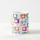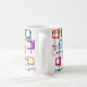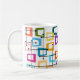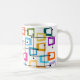 This mug has a design of rectangles that are stretched on one end in groovy colours, orange, green, teal, purple, blue, pink, and yellow with atomic lines crisscrossing them.