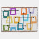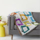 This throw blanket has a design of rectangles that are stretched on one end in groovy colours, orange, green, teal, purple, blue, pink, and yellow with atomic lines crisscrossing them.